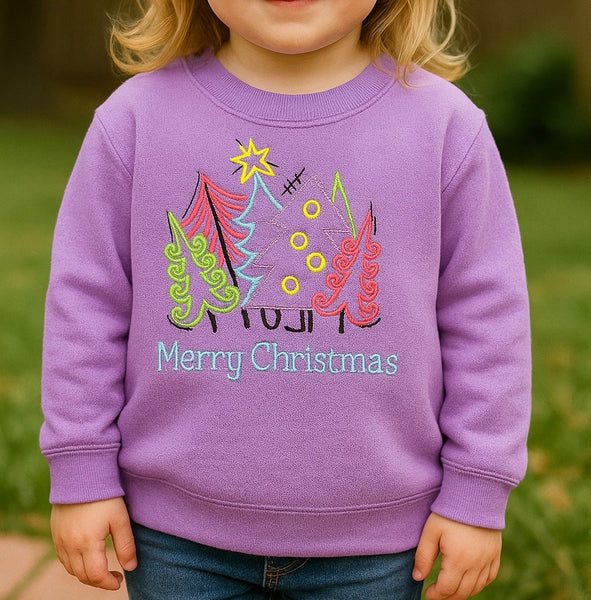 Adorned with a trio of cheerful, curly Christmas trees and a shining yellow star, this cozy pullover is bursting with festive color and charm. Each tree is embroidered in vibrant pinks, blues, and greens—creating a whimsical winter wonderland right on your child’s chest.