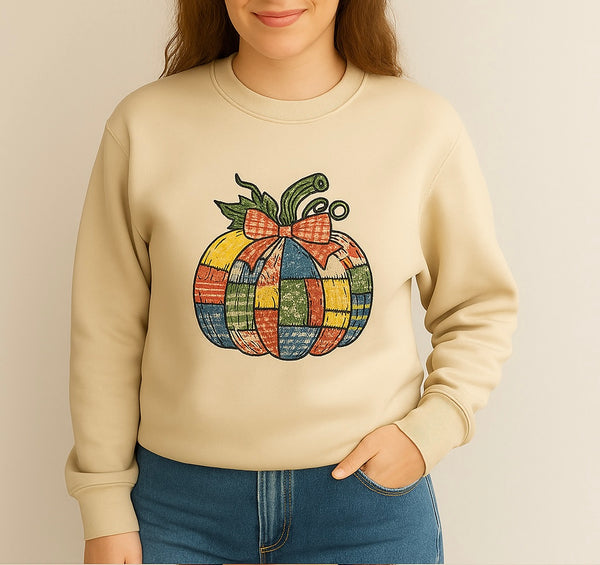 Cozy up for fall with this adorable patchwork pumpkin sweatshirt! Each sweatshirt features a beautifully detailed embroidered pumpkin made up of colorful stitched patterns and a sweet bow on top — the perfect blend of rustic charm and autumn coziness.